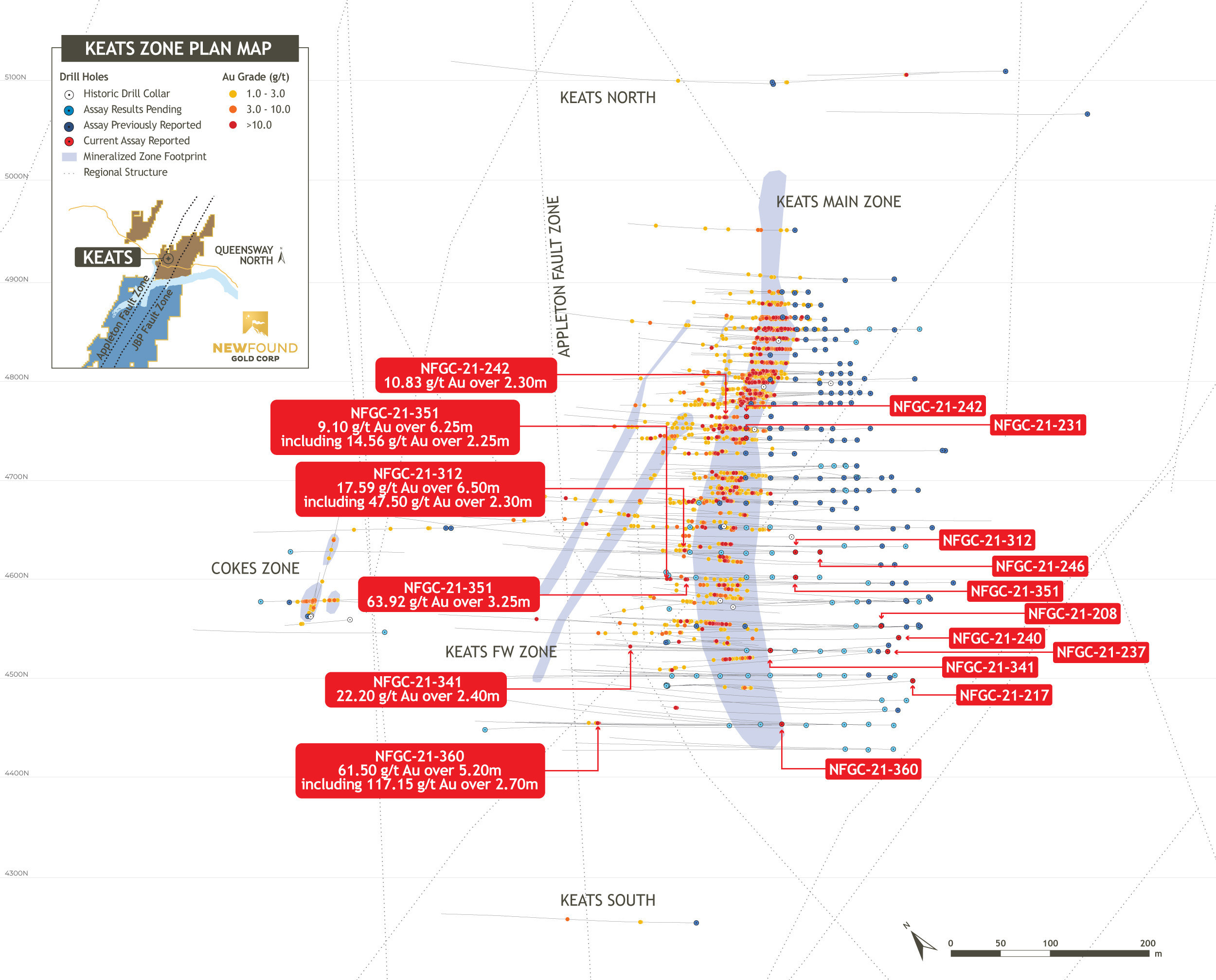 - The Keats Main Zone now extends 530m down-plunge, an increase of 65m from the previously reported distance of 465m defined by the furthest intercept to date in NFGC-21-360 grading 61.50 g/t Au over 5.20m.