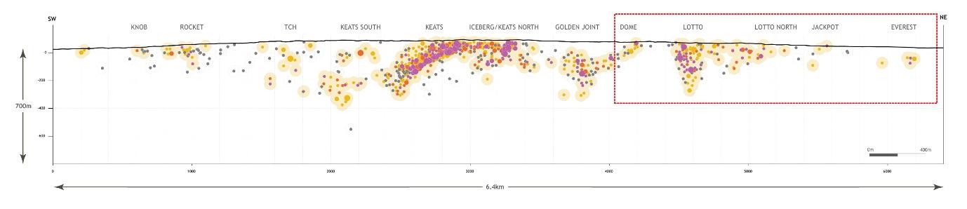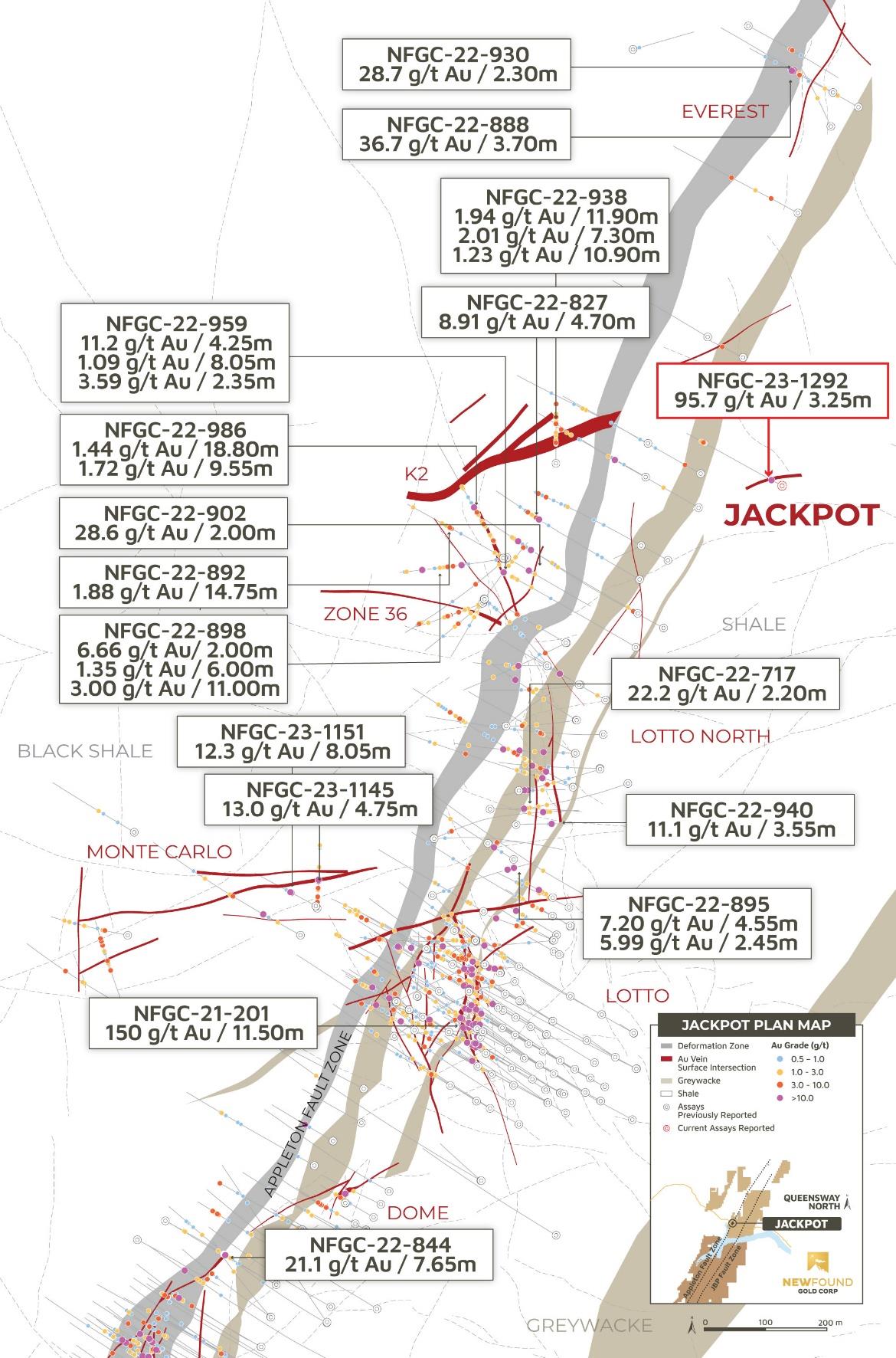 - 95.7 g/t Au over 3.25m in NFGC-23-1292 was intersected in a new zone named “Jackpot” located 2.5km north of Keats and 950m north of Lotto. This new discovery is at a vertical depth of just 20m and is situated 280m east of the AFZ (Figures 2-4).