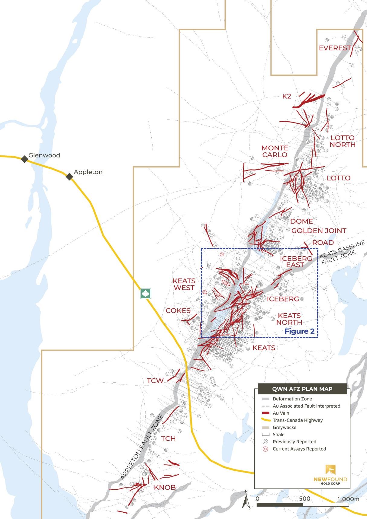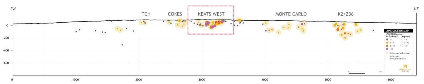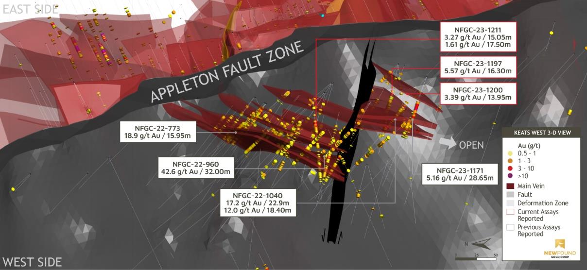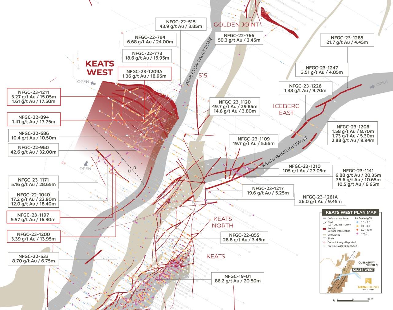 Vancouver, BC, June 14, 2023 – New Found Gold Corp. (“New Found” or the “Company”) (TSX-V: NFG, NYSE-A: NFGC) is pleased to announce the results from nine diamond drill holes that were completed as part of a drill program designed to test the newly discovered Keats West zone, a low-angle thrust fault that dips gently to the south-southwest and is located on the west side of the highly prospective Appleton Fault Zone (“AFZ”). New Found’s 100%-owned Queensway project comprises a 1,662km2 area, accessible via the Trans-Canada Highway, 15km west of Gander, Newfoundland and Labrador.