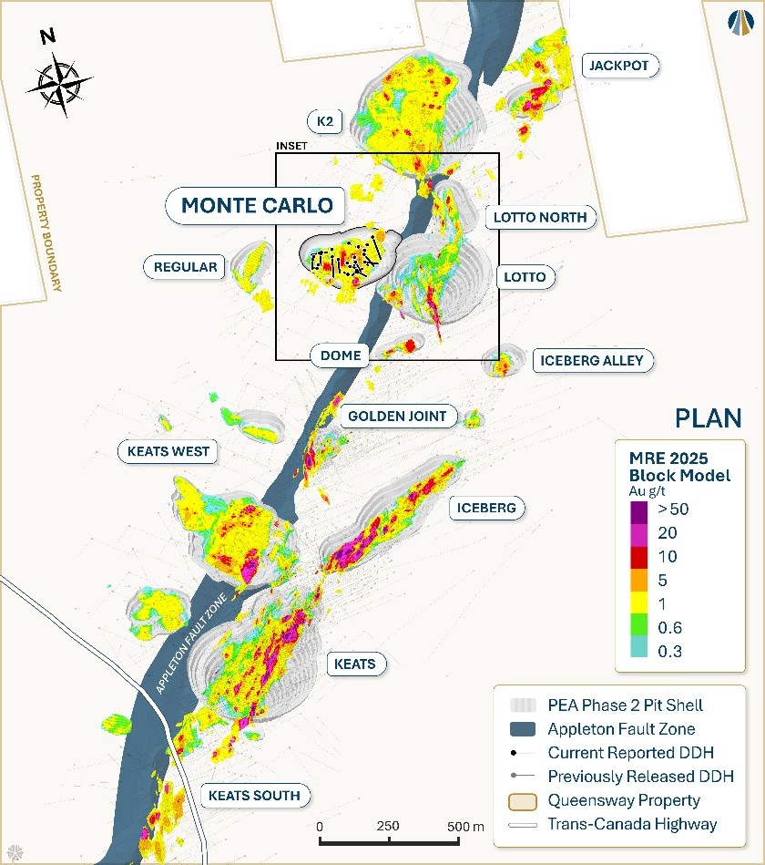 Melissa Render, President of New Found Gold stated: “We are pleased to report these results from infill drilling of Phase I and II open pits at Monte Carlo. Overall, we see consistency with past drilling, indicating good continuity of gold mineralization in this proposed open pit. Select holes from 2025 drilling have returned higher grade intervals than in the initial mineral resource estimate block model. We look forward to integrating these results into the updated Queensway mineral resource currently planned for H1/26.”
