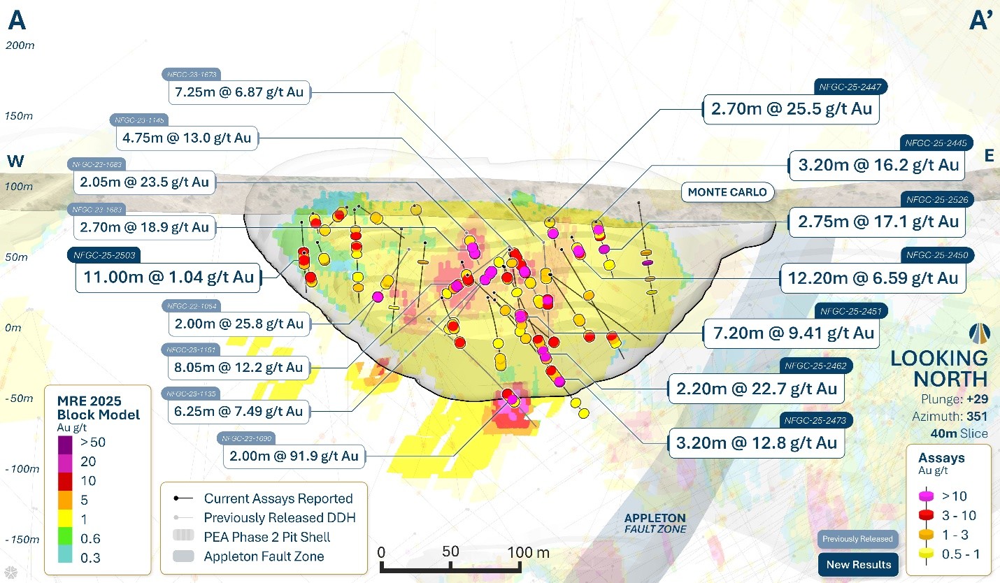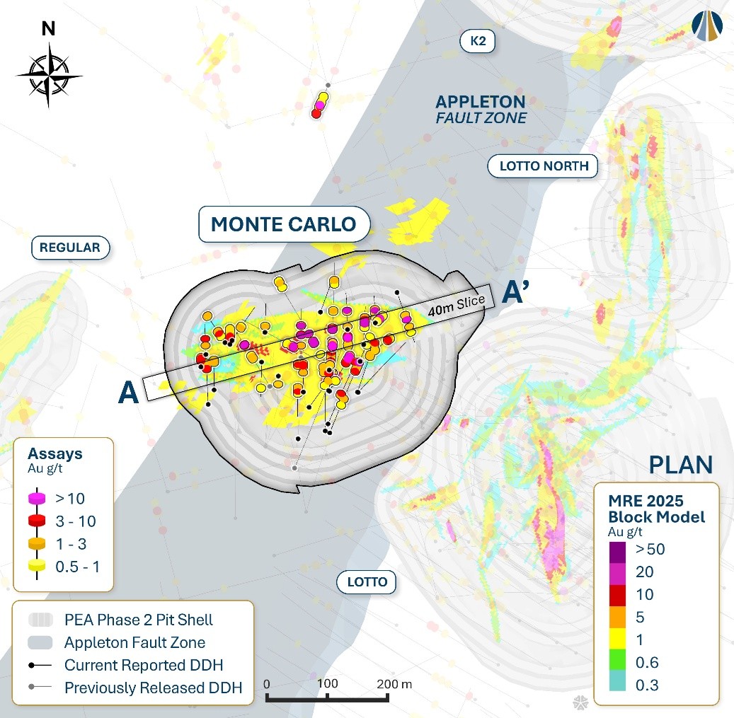 Gold mineralization at Monte Carlo extends over a strike length of approximately 235 m and to a depth of 160 m, hosted within an east-west trending, steeply south-dipping fault zone situated on the western side of the Appleton Fault Zone, adjacent to the Lotto Zone. In addition to the defined open-pit resources, the underground component outlined in the PEA remains open for further expansion.