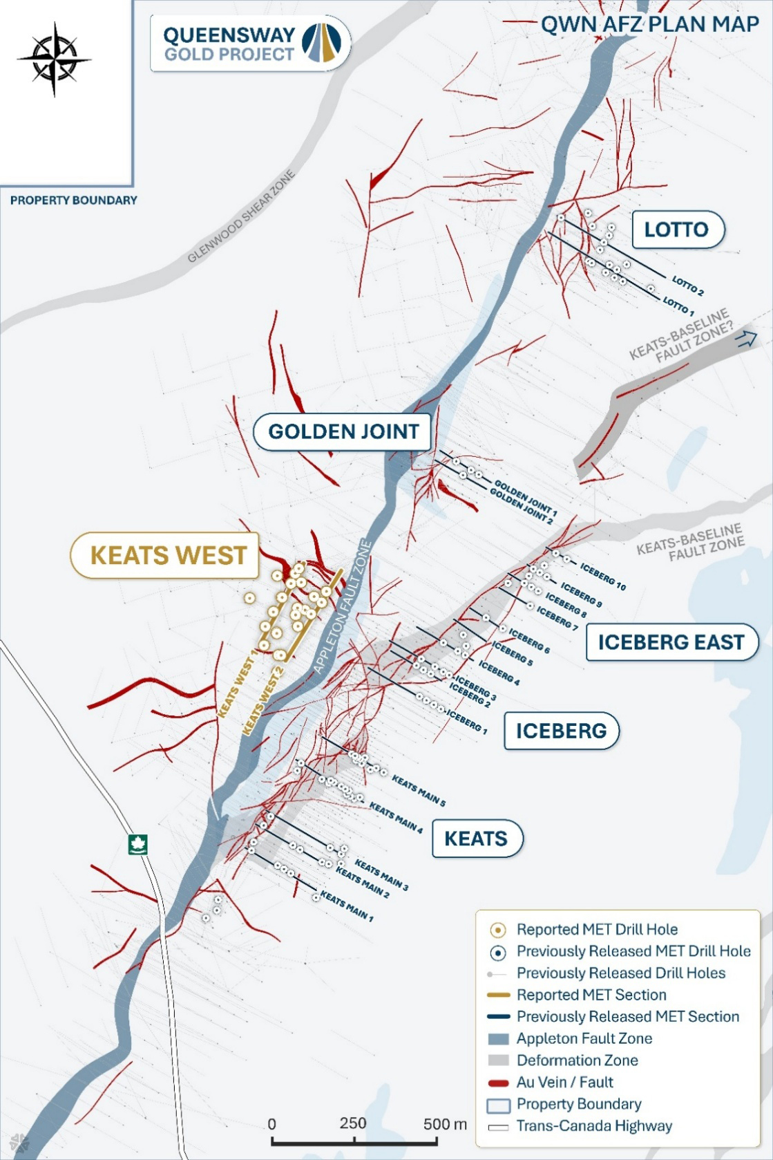 - Average recoveries of 87% were achieved from rougher stage flotation on select low grade samples from the Keats, Golden Joint, Lotto and Iceberg zones initially tested in Phases I and II of the Queensway metallurgical testing program², with further work planned.