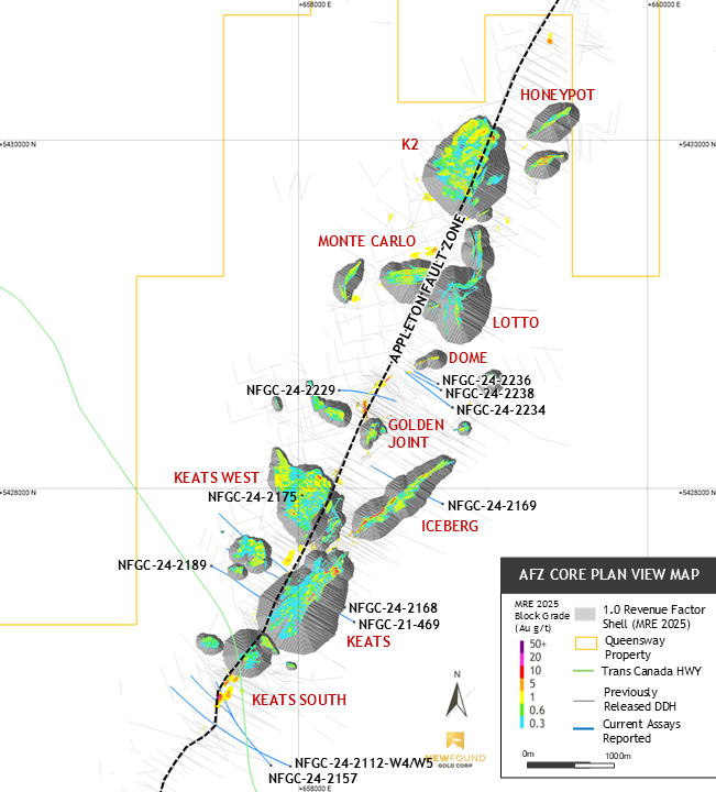 This news release includes results from 7,765 m of drilling in 12 diamond drill holes (“DDH”) completed in Q4/24 as part of a step-out program targeting the depth extension of Dome, and a deep drilling program testing the main structural corridor associated with known gold mineralization at Queensway (Dome-Golden Dome, Keats-AFZ Deep and KSD on Figure 1). Eleven of the 12 DDH reported herein were drilled outside the initial mineral resource estimate (“MRE”) area (see the New Found Gold news release dated March 24, 2025).