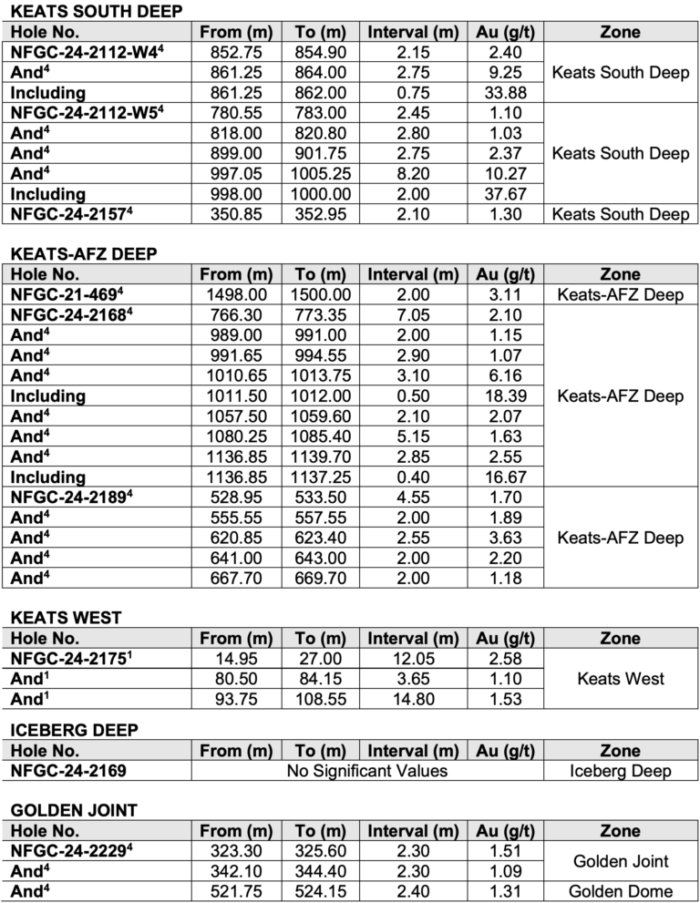 - 6.16 g/t Au over 3.10 m, including 18.4 g/t Au over 0.50 m from the Keats-Appleton Fault Zone Deep Zone (“Keats-AFZ Deep”, NFGC-24-2168)
