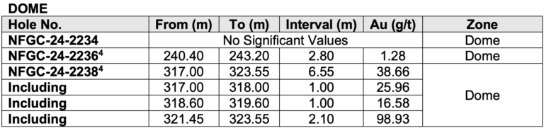 - 38.7 g/t Au over 6.55 m, including 98.9 g/t Au over 2.10 m from the Dome Zone (“Dome”; NFGC-24-2238)