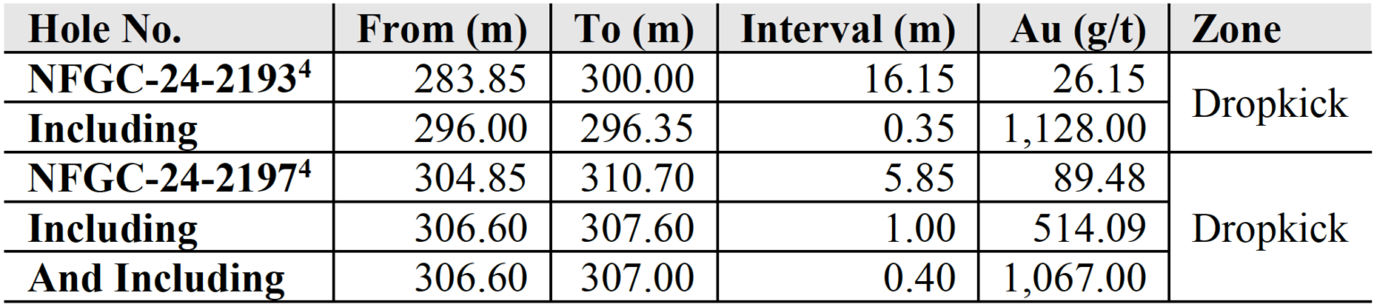 - The high-grade intervals reported today occur on the southwest extent of the Dropkick Zone and are the first intercepts to indicate the high-grade potential for this segment of the structure. Drilling along strike to the northeast encountered lower grades accompanied by encouraging characteristics diagnostic of many of the productive structures identified to date.