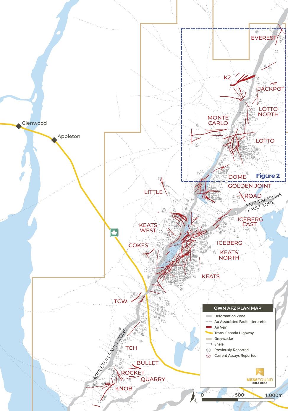 Melissa Render, VP of Exploration of New Found, stated: “Our targeted drill program continues to successfully outline new zones of gold mineralization. Jackpot is the sixteenth near surface zone identified along a 4.1km stretch of Appleton North, starting at the south end of Keats and running up to Everest. Initial drilling at Jackpot is reminiscent of our early findings at Lotto, a structural zone associated with a strong presence of visible gold. Looking at Figure 2, Jackpot is located 280m east of the AFZ, demonstrating the distal strength of the AFZ. We have locked onto something new here and our ability to interpret and act quickly will allow us to rapidly assess this new and exciting target.”