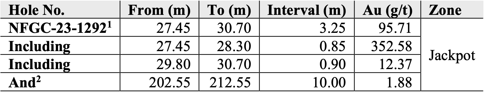 - 95.7 g/t Au over 3.25m in NFGC-23-1292 was intersected in a new zone named “Jackpot” located 2.5km north of Keats and 950m north of Lotto. This new discovery is at a vertical depth of just 20m and is situated 280m east of the AFZ (Figures 2-4).